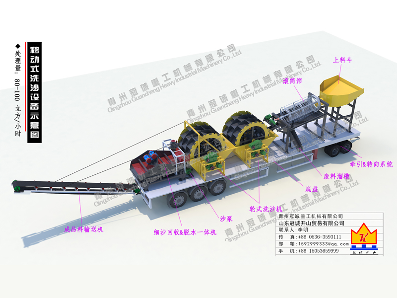 該產(chǎn)品為80-100立方移動(dòng)式洗砂設(shè)備,采用車載輪胎式移動(dòng),搭配兩臺三排輪斗洗沙機(jī),加裝移動(dòng)細(xì)沙回收脫水設(shè)備,操作簡單,流動(dòng)式作業(yè),隨洗隨走,省卻了打底座的煩惱,省時(shí)高效。